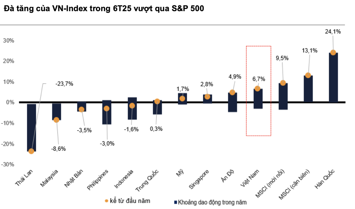 Trong báo cáo mới phát hành, Công ty Chứng khoán VNDirect đánh giá, VN-Index ghi nhận mức tăng ấn tượng 6,7% từ đầu năm, vượt trội so với các thị trường trong khu vực như: SET Thái Lan (-23,7%), FBMKLCI Malaysia (-8,6%), PCOMP Philippines (-3,0%), JCI Indonesia (-1,6%) và STI Singapore (+2,8%).