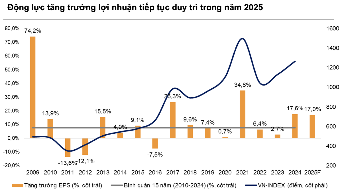 Nhóm phân tích kỳ vọng những yếu tố này sẽ hỗ trợ tăng trưởng lợi nhuận ròng năm 2025 của các công ty niêm yết trên HOSE dao động trong khoảng 12 - 17%. Một đợt nâng hạng từ FTSE dự kiến sẽ hỗ trợ định giá, với kịch bản cơ sở đặt mục tiêu VN- Index đạt 1.450 điểm vào cuối năm 2025, hệ số P/E mục tiêu ở mức 13,5 lần.