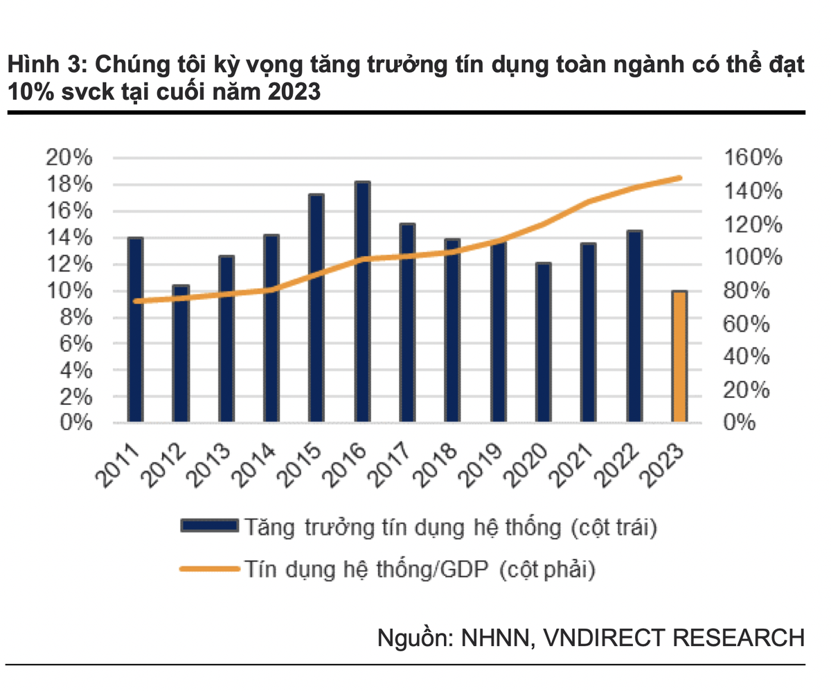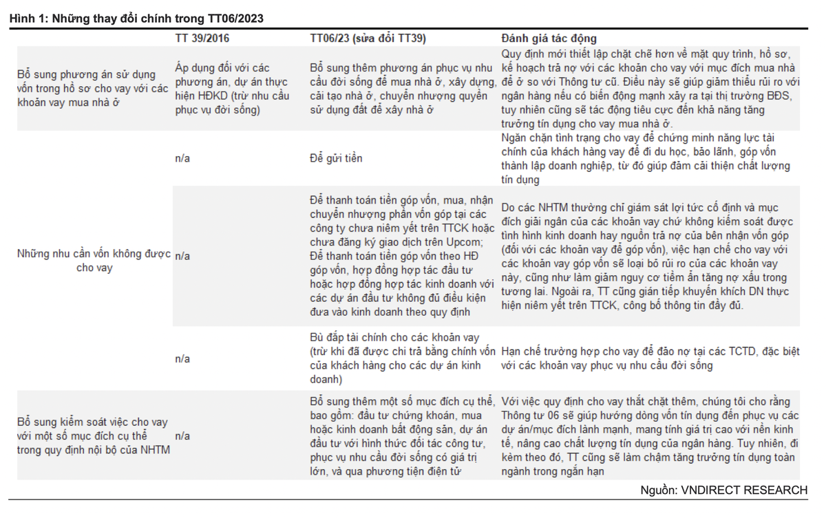 “Với việc quy định cho vay thắt chặt thêm, chúng tôi cho rằng Thông tư sẽ có thể làm chậm lại tăng trưởng tín dụng trong ngắn hạn tuy nhiên dài hạn sẽ đảm bảo an toàn hơn cho toàn bộ nền kinh tế. Tính đến ngày 15/06/23 tăng trưởng tín dụng toàn ngành chỉ đạt 3,36% so với đầu năm - mức thấp nhất trong vòng 10 năm trở lại đây. Cho năm 2023, chúng tôi kỳ vọng tăng trưởng tín dụng toàn ngành có thể đạt mức 10% - thấp hơn so với mục tiêu 14-15% của NHNN”, VNDirect nhận định.
