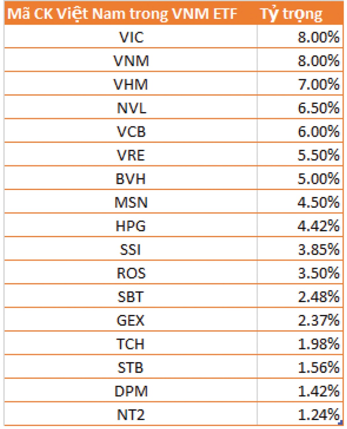 Trước đó, VNM ETF đã loại VCG ra khỏi danh mục trong tuần từ 10 - 17/11/2018 do doanh nghiệp "khóa" tỷ lệ sở hữu tối đa của nhà đầu tư nước ngoài về 0%. Như vậy, sau khi GEX vào danh mục, thay thế VCG, số lượng cổ phiếu Việt Nam trong danh mục MVIS Vietnam Index chiếm 17/25 cổ phiếu. Tỷ trọng lớn nhất vẫn thuộc về VIC và VNM (8%), kế đó là VHM (7%).