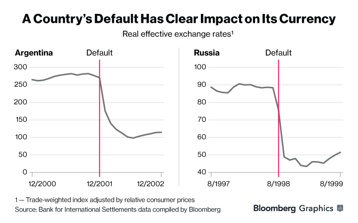 Đối với Nga và Argentina, việc vỡ nợ đã khiến đồng tiền của mỗi nước tụt dốc không đáy.