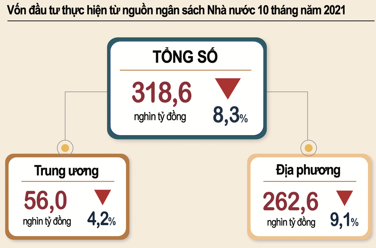 Tính chung 10 tháng năm 2021, vốn đầu tư thực hiện từ nguồn ngân sách Nhà nước đạt 318,6 nghìn tỷ đồng, bằng 64,7% kế hoạch năm và giảm 8,3% so với cùng kỳ năm trước (cùng kỳ năm 2020 bằng 67,8% và tăng 31,6%).