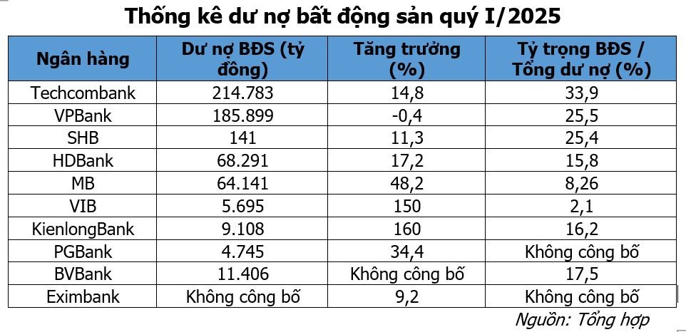 Thống kê từ báo cáo tài chính của 12 ngân hàng niêm yết cũng cho thấy rõ nét xu hướng này. Cụ thể, tổng dư nợ cho vay hoạt động kinh doanh bất động sản của các ngân hàng đã tăng 9,7% chỉ trong quý đầu tiên của năm 2025. Tỷ trọng cho vay lĩnh vực này trong tổng dư nợ của các ngân hàng cũng tăng từ 16,58% vào cuối năm 2024 lên 17,3% vào cuối quý I/2025.