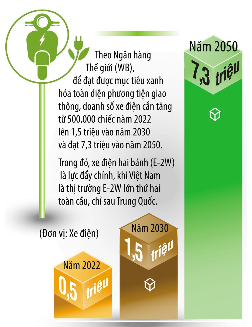 Việt Nam vẫn thiếu khung pháp lý rõ ràng cho trạm sạc, tiêu chuẩn kỹ thuật cho pin, mô hình thuê pin… Trong khi đó, các đề xuất về chuyển đổi năng lượng xanh của ngành giao thông - vận tải và ngành công thương đã đặt mục tiêu đến năm 2030, sẽ có 50% phương tiện sử dụng điện hoặc năng lượng xanh, 100% xe taxi đầu tư mới dùng điện và đến năm 2050, tất cả xe buýt, taxi đều chạy điện.