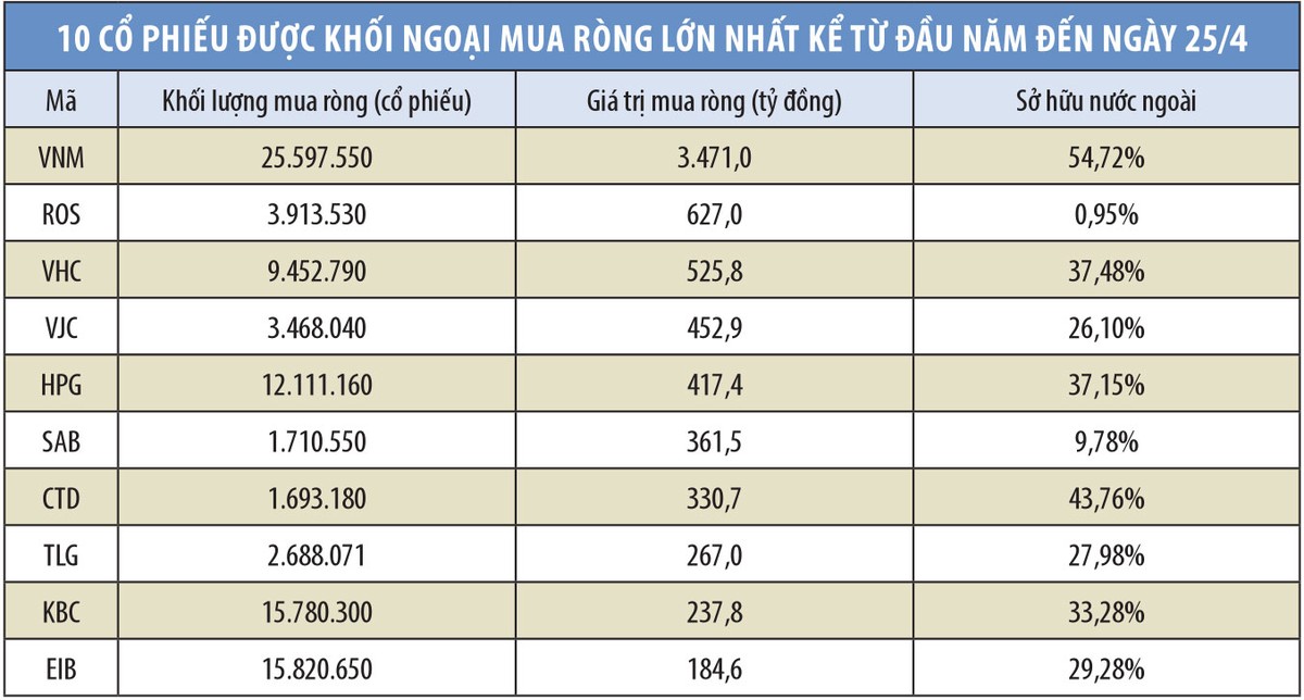 Tính chung cả hai sàn HOSE và HNX đến hết phiên 25/4, khối ngoại đã mua vào 880,9 triệu cổ phiếu, trị giá 36.867 tỷ đồng, trong khi bán ra 914,2 triệu cổ phiếu, trị giá hơn 31.273 tỷ đồng. Theo đó, khối ngoại bán ròng về khối lượng 33,2 triệu cổ phiếu, nhưng mua ròng về giá trị gần 5.600 tỷ đồng.