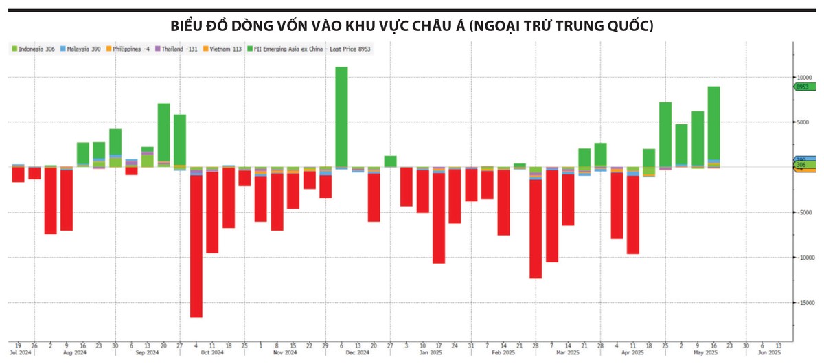 Thứ hai, đồng USD suy yếu. Sự mất giá mạnh mẽ của đồng USD trong thời gian qua do lo ngại về tác động tiêu cực của chính sách thuế quan từ Mỹ đến tăng trưởng kinh tế nước này đã làm giảm sức hấp dẫn của tài sản Mỹ. Bên cạnh đó, lợi suất trái phiếu Mỹ liên tục lập đỉnh khi Moody’s hạ xếp hạng tín nhiệm của Mỹ cho thấy làn sóng bán tháo trái phiếu kho bạc Mỹ. Các thị trường mới nổi phục hồi mạnh hơn sau nhịp biến động của tháng 4 vừa qua, cùng với chính sách nới lỏng tiền tệ mạnh tay hơn tại Trung Quốc đang tạo nên sức hấp dẫn của thị trường chứng khoán châu Á và thị trường mới nổi.