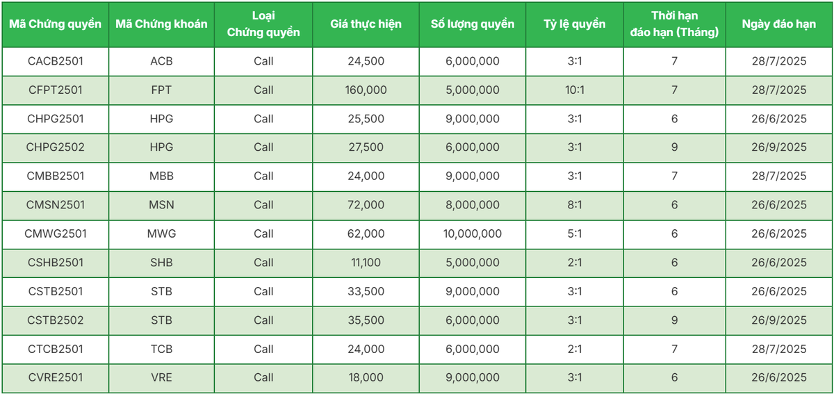 12 mã CW này được phát hành dựa trên 10 cổ phiếu hàng đầu, thuộc những ngành như ngân hàng (ACB, MBB, SHB, STB, TCB), vật liệu xây dựng (HPG), công nghệ thông tin (FPT) và bán lẻ (MWG, MSN, VRE).