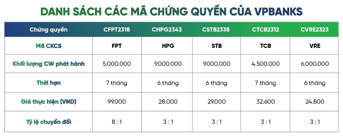 Nhằm gia tăng sự lựa chọn cho khách hàng trong hành trình đầu tư, Chứng khoán VPBank (VPBankS) chính thức ra mắt 5 mã CW mua mới với tổng số lượng phát hành hơn 33 triệu. Việc tham gia phát hành CW sẽ giúp VPBankS bổ sung thêm nhiều mảng nghiệp vụ hoạt động chính cho công ty, từ đó tạo nguồn thu đa dạng hơn, góp phần nâng cao năng lực hoạt động của công ty chứng khoán. Đồng thời, cũng giúp khách hàng có thêm một sản phẩm đầu tư nhằm giảm thiểu rủi ro và gia tăng lợi nhuận.
