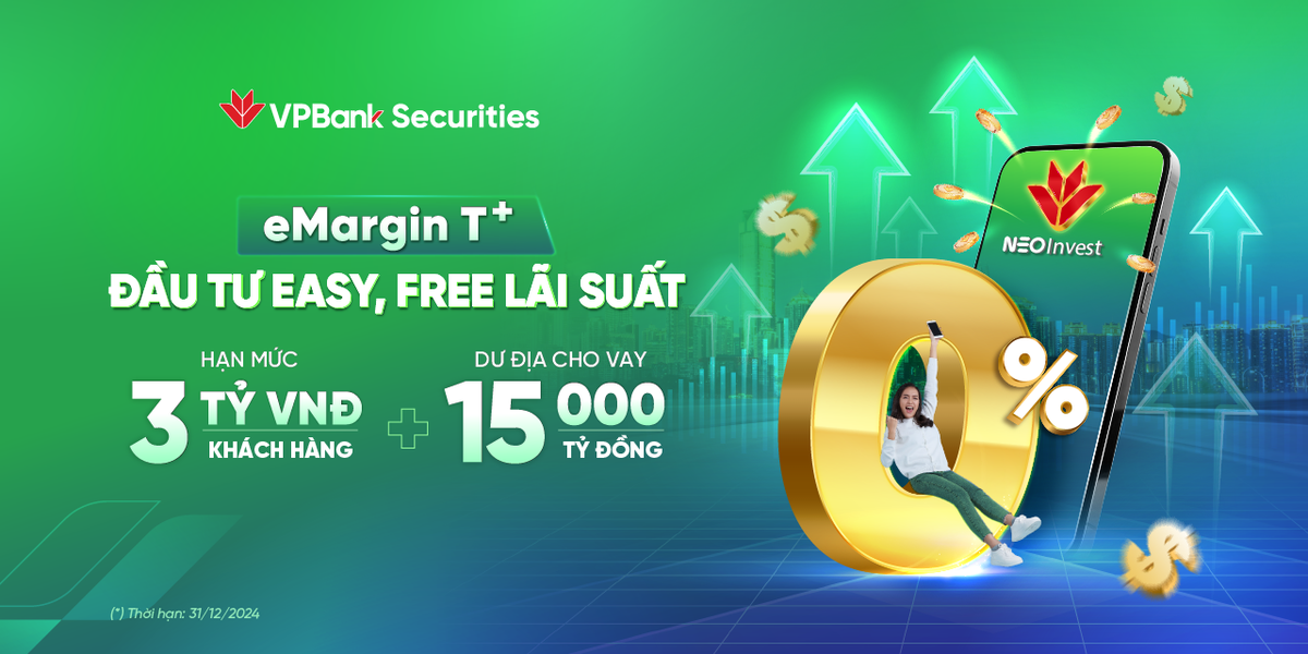 Ưu đãi margini T+ áp dụng với mọi khách hàng của VPBankS đến 31/12/2024, với hạn mức tối đa lên tới 3 tỷ đồng/khách hàng.
