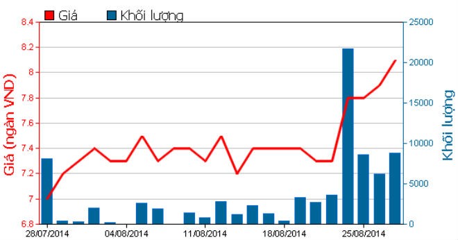 Biểu đồ giá, khối lượng giao dịch của mã VPH trong 1 tháng qua. Nguồn: HOSE