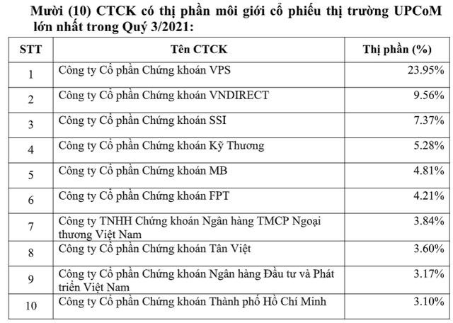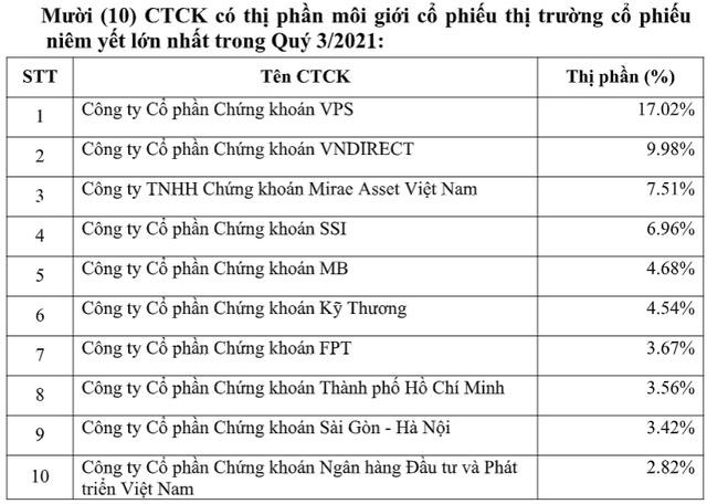 Theo số liệu mới nhất của Sở Giao dịch Chứng khoán Hà Nội (HNX), VPS dẫn đầu danh sách 10 công ty chứng khoán có thị phần môi giới cổ phiếu lớn nhất trong quý III/2021 với mức tăng trưởng 17,02%, tạo cách biệt tới 7,04 điểm phần trăm so với công ty đứng thứ 2. Trên UPCoM, công ty cũng đứng đầu về thị phần với mức tăng trưởng mạnh mẽ từ 18,63% trong quý II/2021 lên 23,95% trong quý vừa qua.