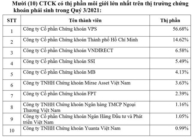 Ở mảng môi giới chứng khoán phái sinh, VPS tiếp tục duy trì vị thế vượt trội với 56,68% thị phần trong quý vừa qua. Kể từ tháng 4/2018 khi lần đầu tiên vươn lên dẫn đầu thị phần môi giới chứng khoán phái sinh, VPS đã duy trì đà phát triển và liên tục xô đổ những kỷ lục về tỷ lệ chiếm lĩnh thị phần do chính mình thiết lập. Tính riêng quý II/2021, VPS đã đạt 54,58% thị phần.