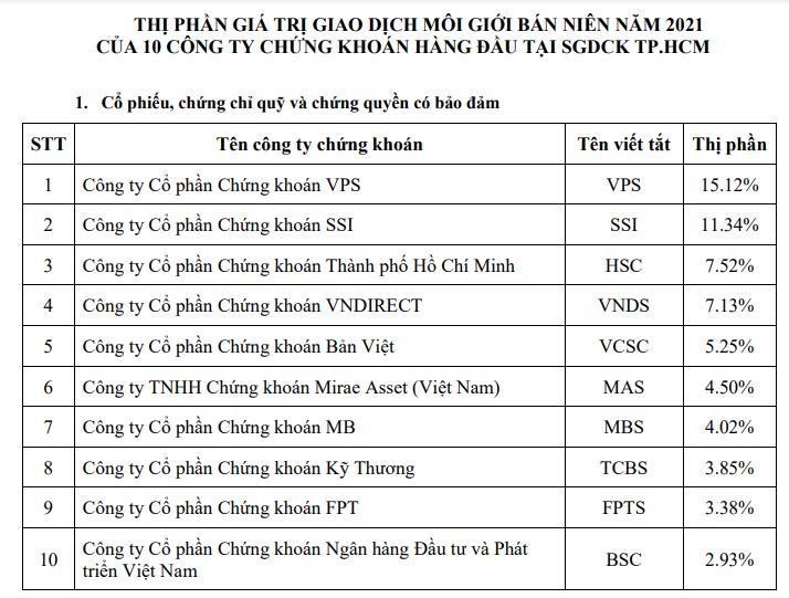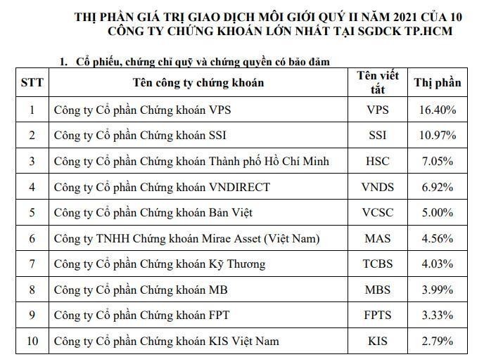 Đây là quý thứ 2 liên tiếp VPS đứng đầu bảng xếp hạng của HOSE. Trong quý 1/2021 VPS lần đầu tiên vươn lên chiếm lĩnh vị trí số 1 về thị phần môi giới cổ phiếu trên HOSE với 13,24%thị phần.