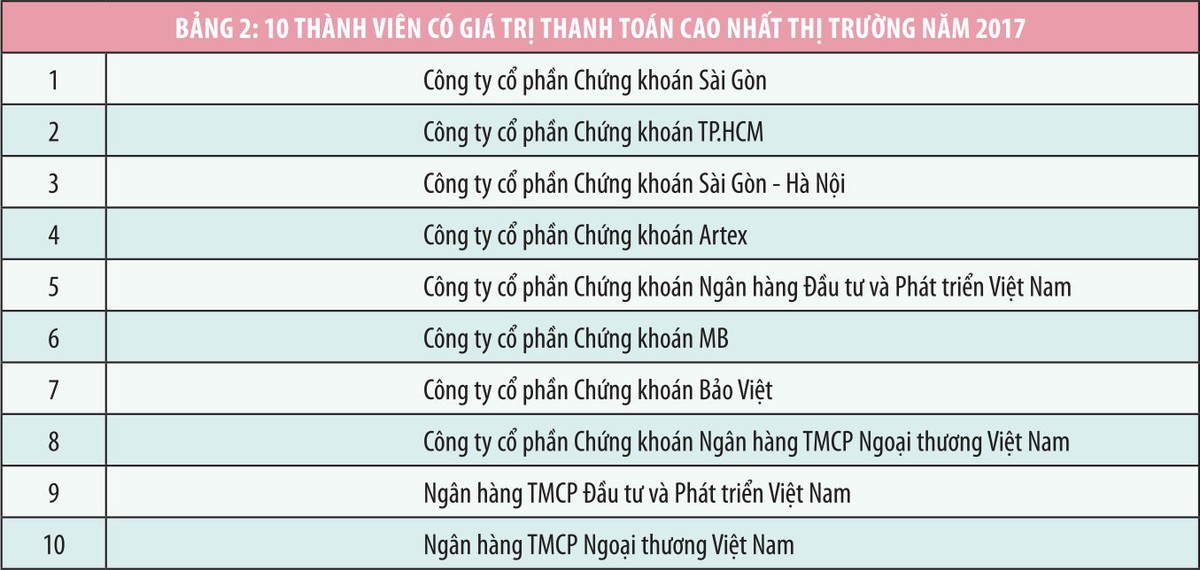 Cùng với sự khởi sắc của thị trường, tính thanh khoản của thị trường cũng tăng nhanh. Tính đến 30/11/2017, tổng giá trị thanh toán tiền giao dịch chứng khoán qua VSD trên thị trường chứng khoán cơ sở là xấp xỉ 3.150.474 tỷ đồng, tăng 60% so với cùng kỳ, tổng giá trị thanh toán của thị trường chứng khoán phái sinh là gần 173 tỷ đồng.