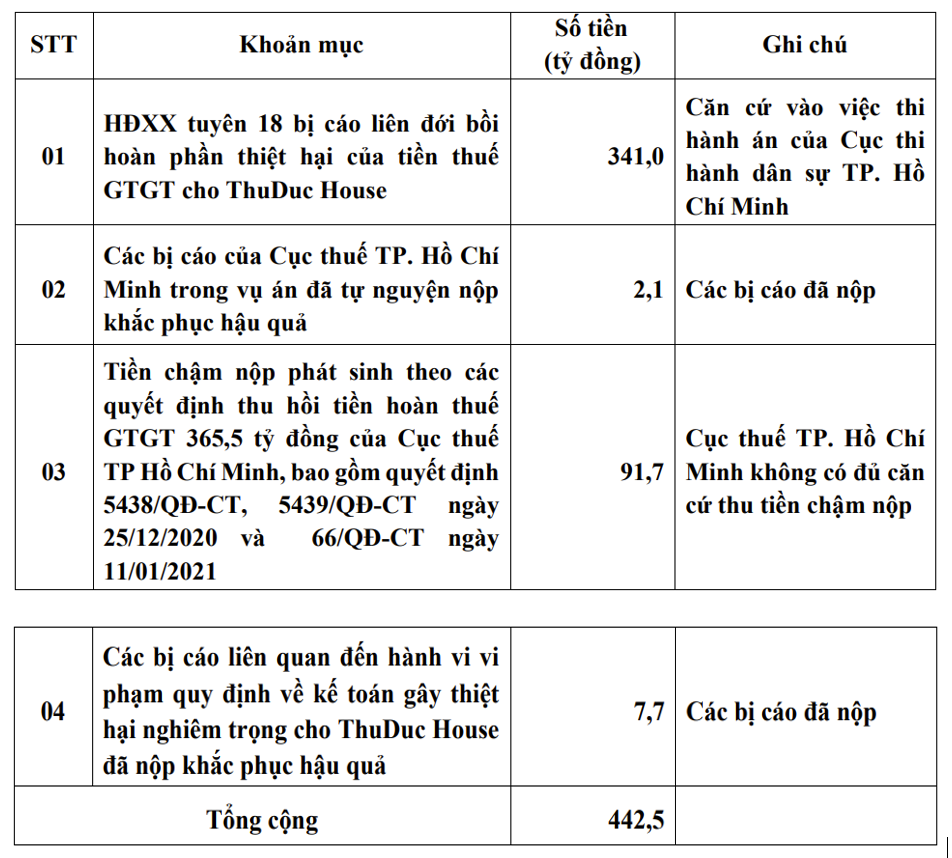 Sau khi trừ đi phần thu lợi bất chính của ThuDuc House liên quan đến hoạt động kinh doanh linh kiện điện tử giai đoạn 2017-2019 là 22,4 tỷ đồng và số tiền các bị cáo của Cục thuế TP. HCM trong vụ án đã tự nguyện nộp khắc phục hậu quả để chuyển cho ThuDuc House là 2,1 tỷ đồng thì số tiền thuế GTGT của ThuDuc House còn thiệt hại là 341,0 tỷ đồng.