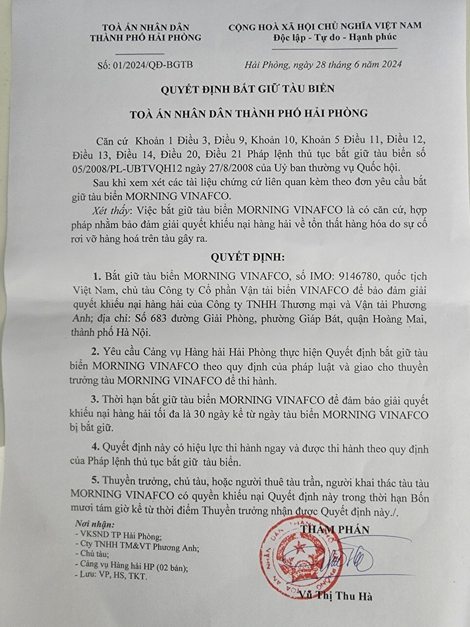 “Thời hạn bắt giữ tàu biển Morning Vinafco để đảm bảo giải quyết khiếu nại hàng hải tối đa là 30 ngày kể từ ngày tàu biển Morning Vinafco bị bắt giữ. Quyết định bắt giữ có hiệu lực thi hành ngay và được thi hành theo quy định".