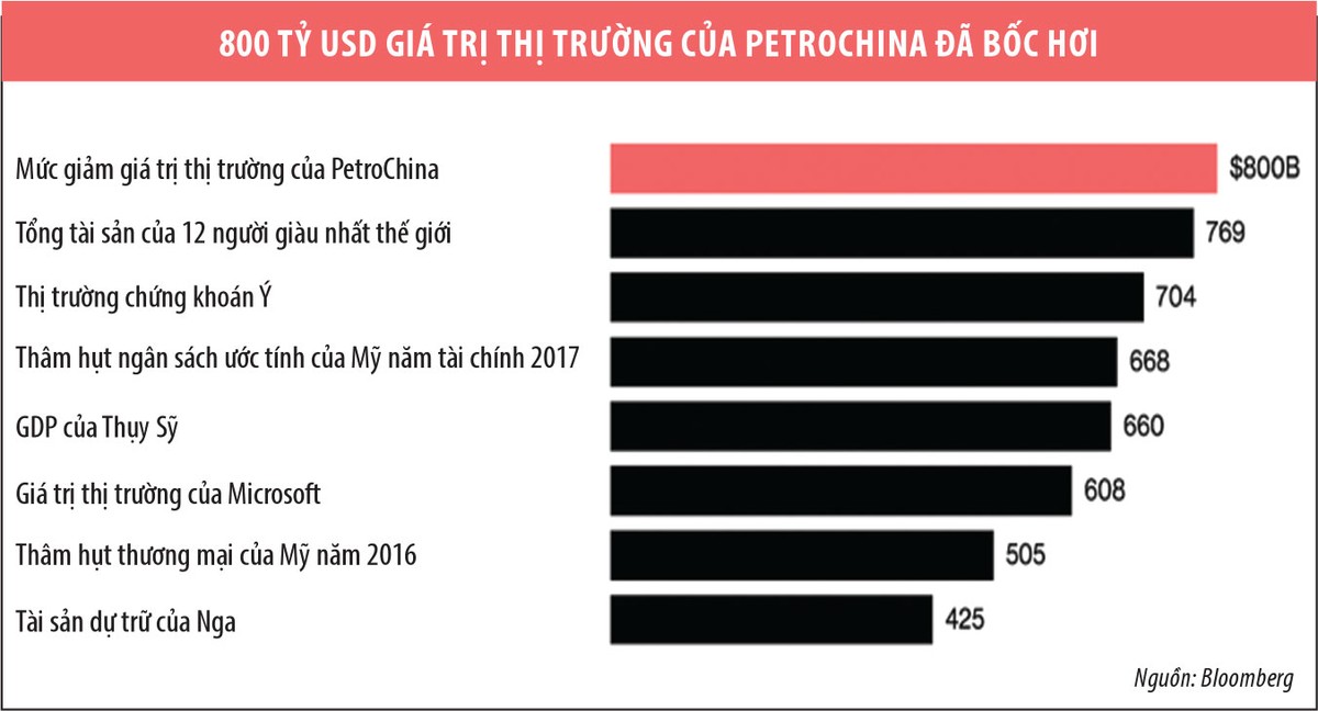 Cách đây 10 năm, cổ phiếu của PetroChina đạt đỉnh ngay ngày đầu tiên giao dịch tại Sàn Giao dịch chứng khoán Thượng Hải. Kể từ đó tới nay, giá trị thị trường của công ty năng lượng thuộc sở hữu nhà nước này đã bốc hơi khoảng 800 tỷ USD – số tiền đủ để mua mọi công ty niêm yết tại Ý, hoặc rải vòng quanh Trái đất 31 lần với tờ 100 USD.