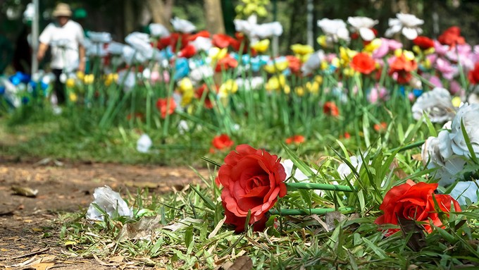 Nhiều người đi vào bên trong khiến vườn hoa trở nên xấu xí. Video: Phong Vinh.