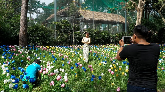 Hàng nghìn đoá tulip, hoa hồng đủ màu sắc được trang trí trong một khuôn viên gần sân khấu chính của Thảo Cầm Viên, thu hút đông người đến tham quan, chụp ảnh. Nhưng sau vài lượt khách đầu tiên ghé chân, nhiều bông hoa đã ngã rạp.