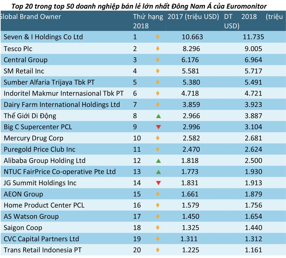 Còn tại khu vực Đông Nam Á, trong Top 50 nhà bán lẻ lớn nhất khu vực cũng do Euromonitor công bố, Thế Giới Di Động đứng ở vị trí thứ 8, trên cả các đại gia như Big C, Alibaba, AEON, Lotte…