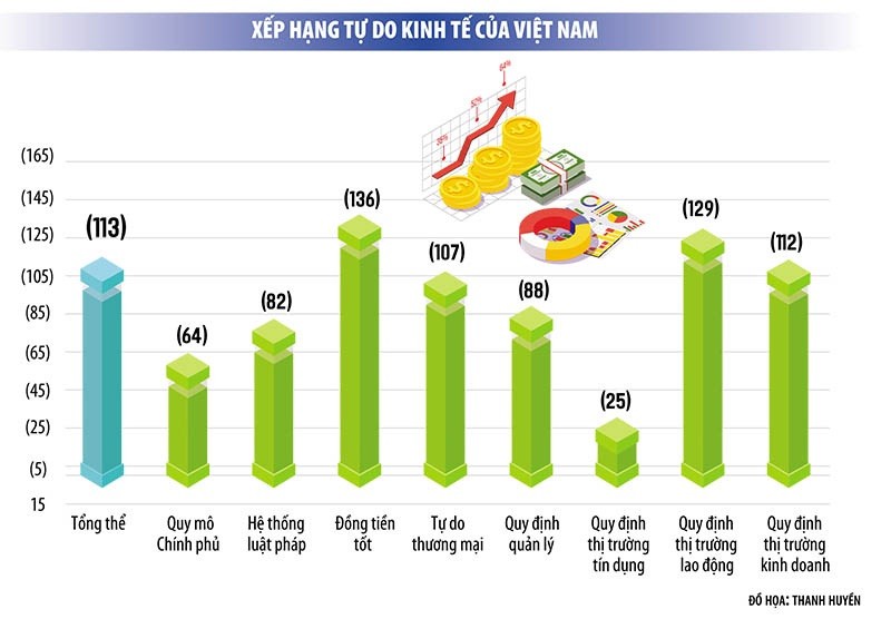 Tuy nhiên, trong xếp hạng về Chỉ số Tự do kinh tế mà TS. Fred McMahon đang là Trưởng nhóm nghiên cứu, thứ hạng của Việt Nam không cao, đứng thứ 113 trong số 165 nền kinh tế. Trong đó, khá nhiều chỉ số thấp, như quy định kinh doanh đứng thứ 112, với gánh nặng pháp lý, thủ tục hành chính và chi phí không chính thức; đứng thứ 129 về quy định thị trường lao động... Về tự do thương mại, Việt Nam xếp hàng 107, vì các rào cản thương mại phi thuế, chi phí tuân thủ cao.