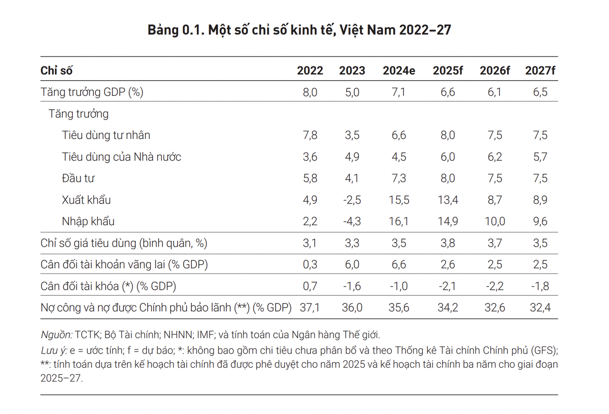 Theo Báo cáo, sau đà tăng trưởng mạnh mẽ nhờ xuất khẩu sớm tăng mạnh trong nửa đầu năm, kinh tế Việt Nam được dự báo sẽ tăng chậm lại trong phần còn lại của năm khi xuất khẩu dần trở về quỹ đạo bình thường. Là nền kinh tế định hướng xuất khẩu, Việt Nam tiếp tục chịu tác động từ triển vọng tăng trưởng toàn cầu suy yếu và nhu cầu giảm từ các đối tác thương mại lớn. Bên cạnh đó, những bất định về chính sách thương mại có thể ảnh hưởng tới niềm tin tiêu dùng và doanh nghiệp.