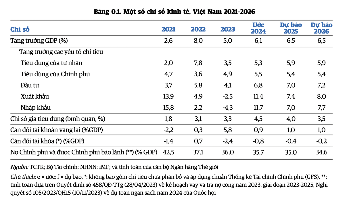 Theo WB, nền kinh tế Việt Nam được dự báo tăng trưởng 6,1% trong năm 2024, sau đó lên đến 6,5% trong các năm 2025 - 2026. Dự báo trên đã xét đến hiệu ứng xuất phát điểm cao hơn kể từ nửa cuối năm 2023 với giả định tăng trưởng xuất khẩu các mặt hàng chế tạo chế biến chững lại trong nửa cuối năm 2024, sau khi phục hồi 16,9% (so với cùng kỳ năm trước) trong nửa đầu năm 2024 và nhu cầu trên toàn cầu dự kiến chững lại năm 2024, nhất là tại Hoa Kỳ, là thị trường xuất khẩu lớn nhất của Việt Nam.
