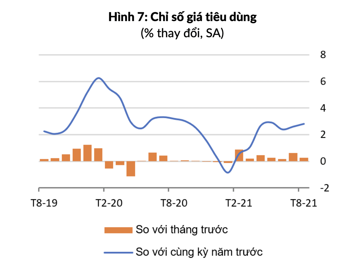Giá cả các mặt hàng ngoài lương thực, thực phẩm khác cũng ổn định do nhu cầu trong nước yếu đi đáng kể trong thời gian giãn cách. So với năm trước, CPI tăng 2,8%, tương đương mức tăng trong tháng 7 và thấp hơn nhiều so với mục tiêu lạm phát 4,0%.