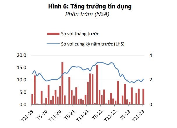 Tăng trưởng tín dụng tăng nhẹ trong tháng 11, tăng ở mức 10,3% so với mức 9,3% trong tháng 10. Tuy nhiên, con số này vẫn thấp hơn nhiều so với mục tiêu tăng trưởng tín dụng mà NHNN đặt ra (14,5%) và mức trước đại dịch. Tăng trưởng tín dụng chậm được WB cho biết là do đầu tư tư nhân và niềm tin của nhà đầu tư tiếp tục suy yếu, một phần liên quan đến tình trạng trì trệ của thị trường bất động sản, vốn chiếm khoảng 21,6% dư nợ tín dụng vào năm 2022.