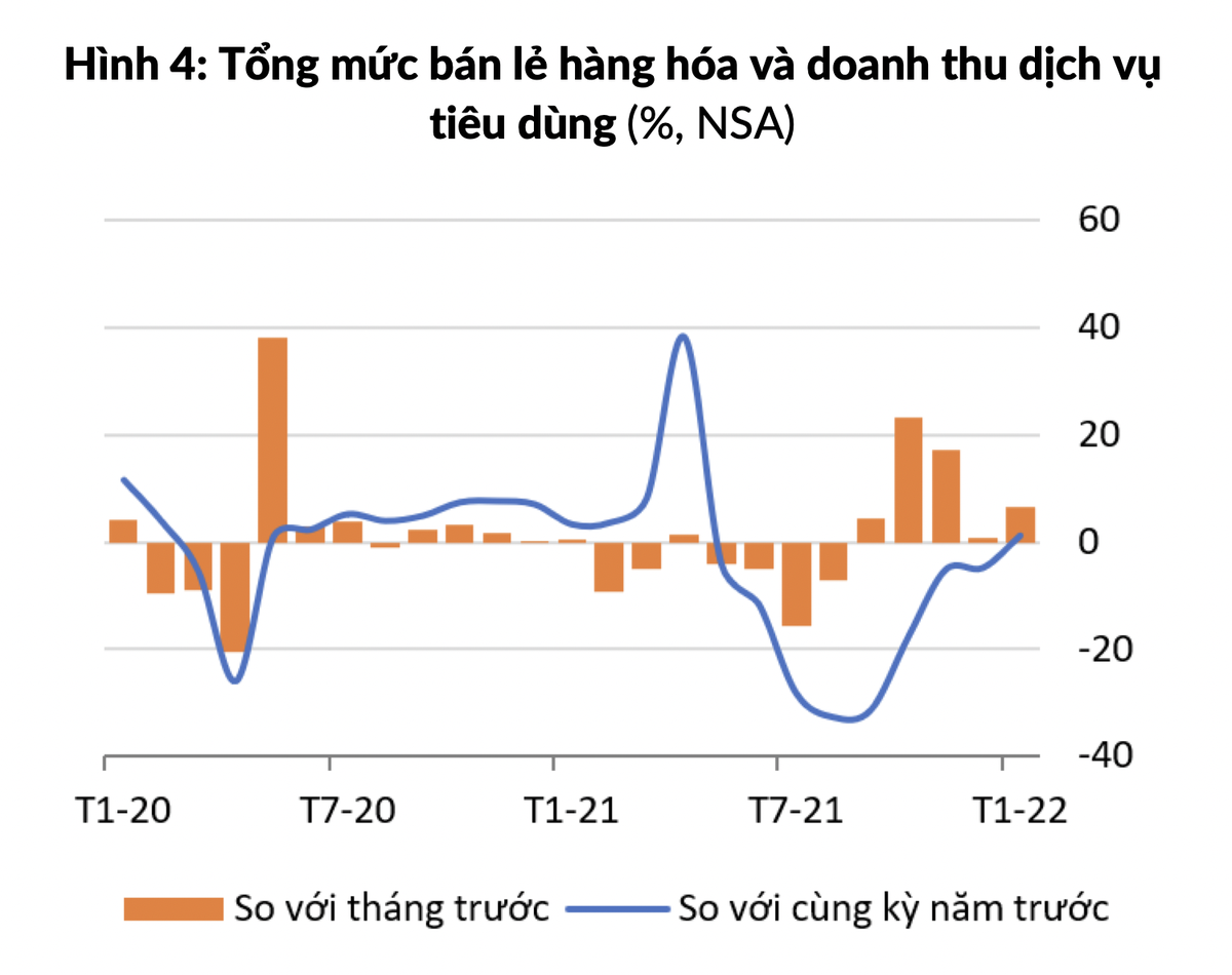 Doanh số bán lẻ hàng hóa chiếm trên 80% tổng mức bán lẻ hàng hóa và doanh thu dịch vụ tiêu dùng, tăng 7,0% so với tháng trước và 4,3% so với cùng kỳ năm trước. Doanh thu dịch vụ tiêu dùng cũng tăng 5,2% so với tháng trước nhưng vẫn thấp hơn 2,2% so với cùng kỳ năm trước.