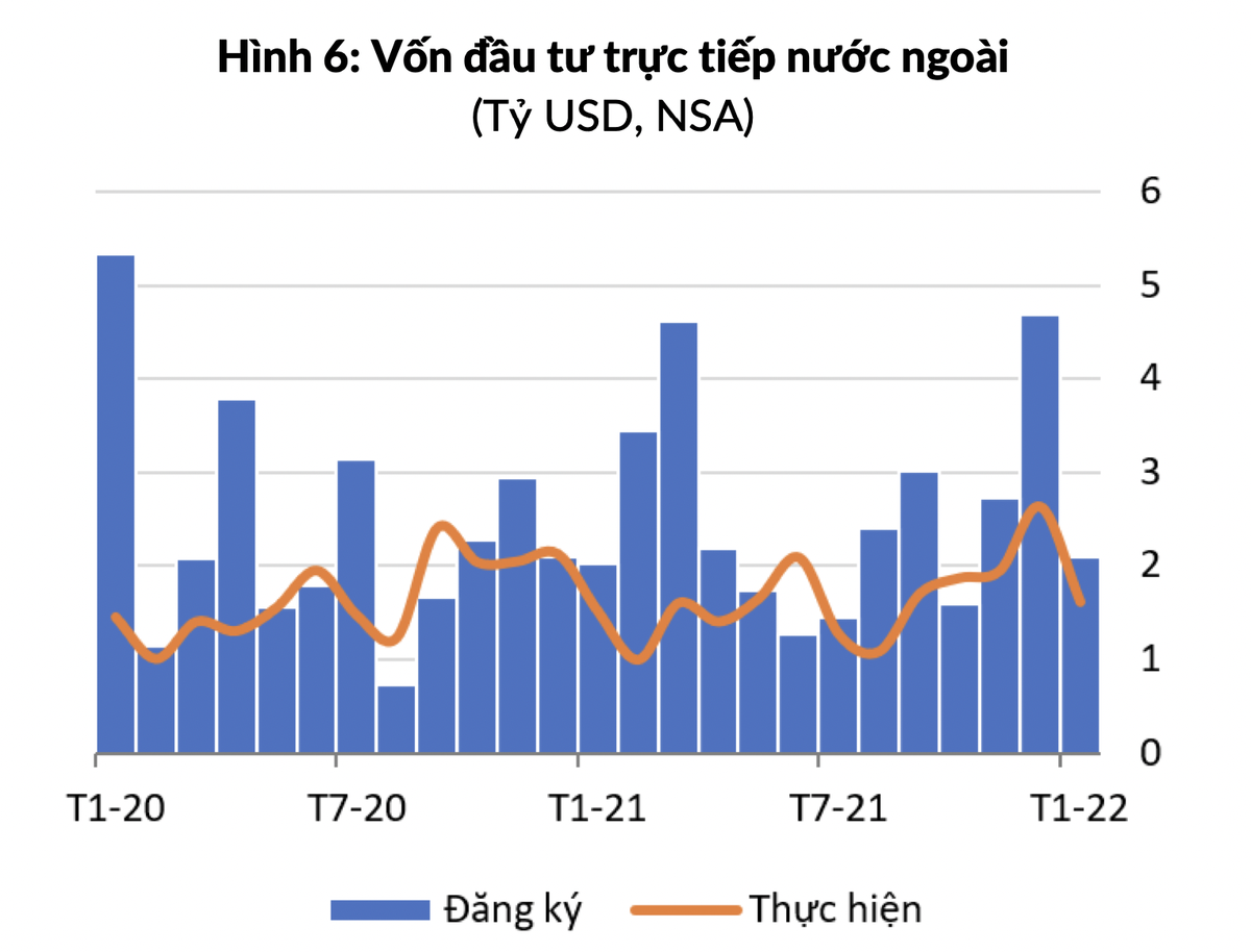 Vốn đăng ký chủ yếu vẫn là vào các lĩnh vực công nghiệp chế biến, chế tạo (gần 60%), tiếp theo là bất động sản (22,5%). Sau khi giảm mạnh trong quý III/2021, giải ngân các dự án FDI đã được phê duyệt tiếp tục phục hồi với tốc độ tăng trưởng 6,8% (so cùng kỳ năm trước) trong tháng 1/2022.