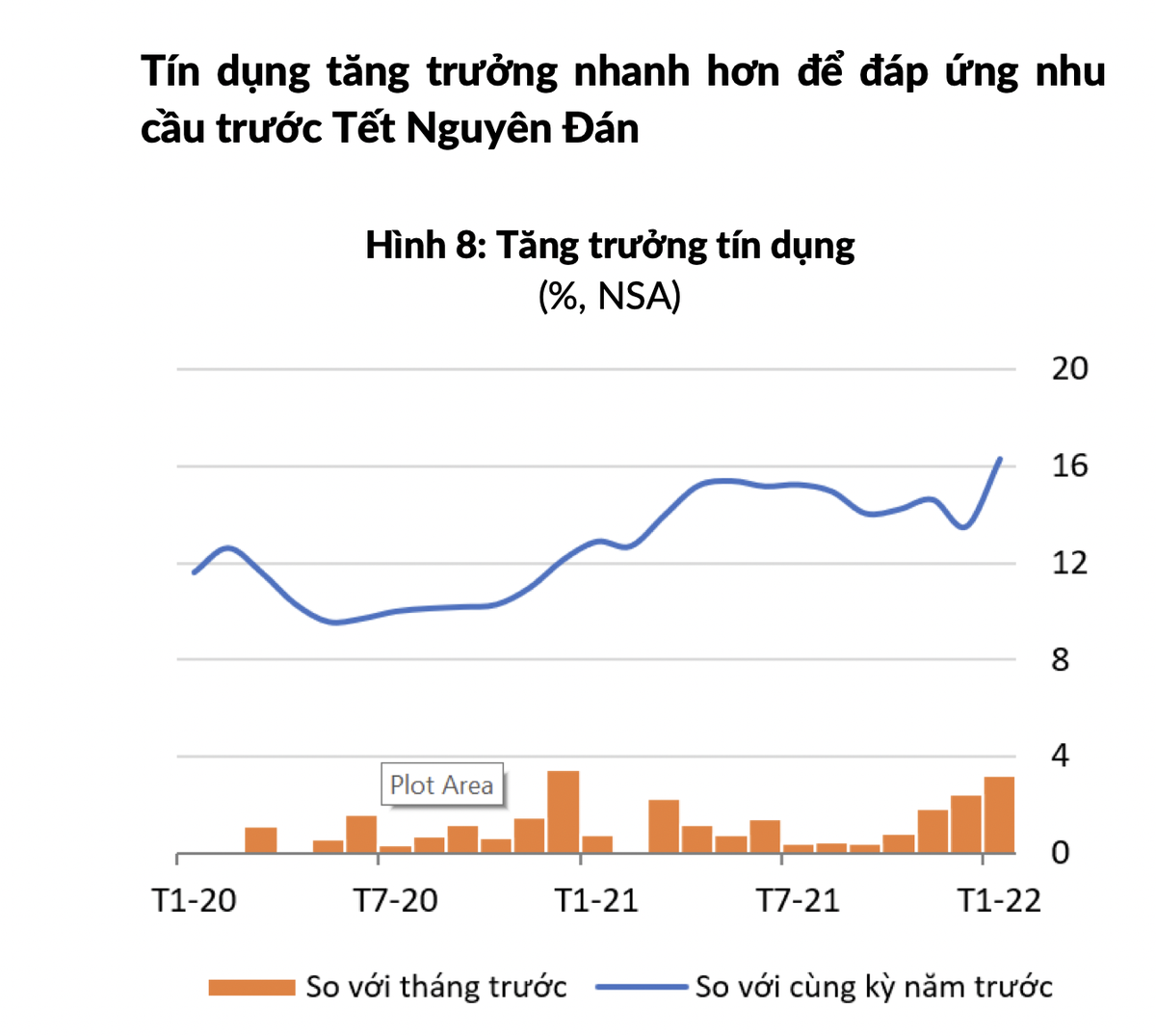 Điểm đáng chú ý là tín dụng đối với nền kinh tế tăng 16,3% (so cùng kỳ năm trước) trong tháng 1, so với 13,5% (so cùng kỳ năm trước) trong tháng 12/2021. Tốc độ tăng trưởng cao hơn là do nhu cầu tín dụng gia tăng khi các doanh nghiệp đẩy mạnh sản xuất và các hộ gia đình đẩy mạnh chi tiêu trước Tết.