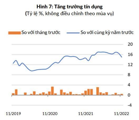 Tăng trưởng tín dụng giảm do tác động của điều kiện huy động tài chính bị thắt chặt sau khi Ngân hàng Nhà nước Việt Nam nâng các mức lãi suất chính lên tổng cộng 200 điểm cơ bản trong tháng 9 và tháng 10. Lãi suất liên ngân hàng qua đêm bình quân vẫn ở mức cao, 5,7% trong tháng 11/2022. Ngoài ra còn do mức trần tăng trưởng tín dụng do NHNN đặt ra, nhưng mức trần này đã được nới lỏng vào đầu tháng 12, khi trần tín dụng được nâng thêm 1,5-2%.