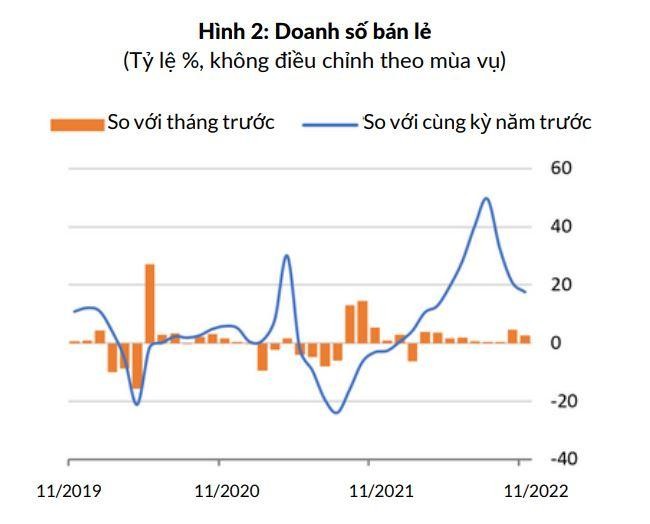 Báo cáo của Ngân hàng Thế giới cho biết, tăng trưởng doanh số bán lẻ cũng giảm từ 20,7% trong tháng 10 (so cùng kỳ) xuống 17,5% trong tháng 11 (so cùng kỳ), tốc độ tăng giảm liên tục trong ba tháng qua. Bên cạnh lý do giảm phần nào do hiệu ứng xuất phát điểm thấp liên quan đến giãn cách COVID-19 trong quý III/2021 đang yếu dần, tốc độ phục hồi tiêu dùng trong 3 quý đầu năm có vẻ cũng đang giảm xuống. Mặc dù du lịch quốc tế tiếp tục phục hồi, nhưng số lượt khách du lịch vẫn thấp hơn nhiều so với thời kỳ trước đại dịch COVID.