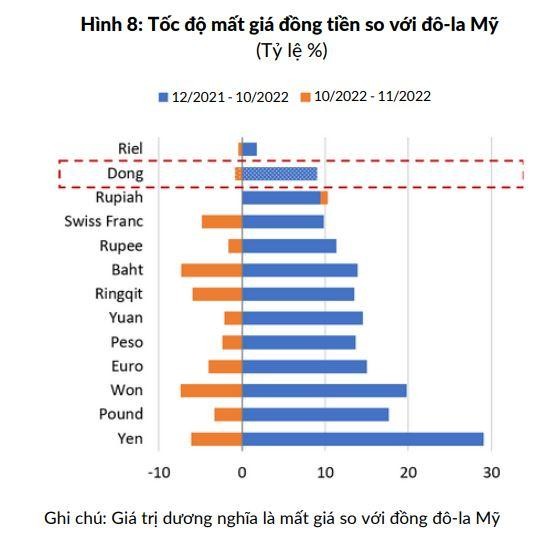 Thực chất, tất cả các đồng tiền lớn và đồng tiền của các quốc gia láng giềng của Việt Nam đều giảm so với đồng USD trong tháng 11/2022. Theo Ngân hàng Thế giới, việc NHNN nâng các mức lãi suất chính sách chính thêm 200 điểm cơ bản trong tháng 9 và tháng 10/2022 cũng góp phần nới nhẹ áp lực đối với đồng nội tệ.
