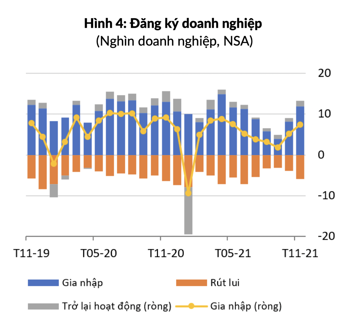 Theo Ngân hàng Thế giới, số lượng doanh nghiệp đăng ký thành lập mới tăng 45% trong tháng 11 (so tháng trước), tháng tăng thứ hai kể từ tháng 5. Số lượng doanh nghiệp rút lui khỏi thị trường cũng tăng, nhưng với tốc độ chậm hơn so với số lượng doanh nghiệp gia nhập. Số doanh nghiệp quay trở lại hoạt động cao hơn số doanh nghiệp tạm ngừng kinh doanh có thời hạn.
