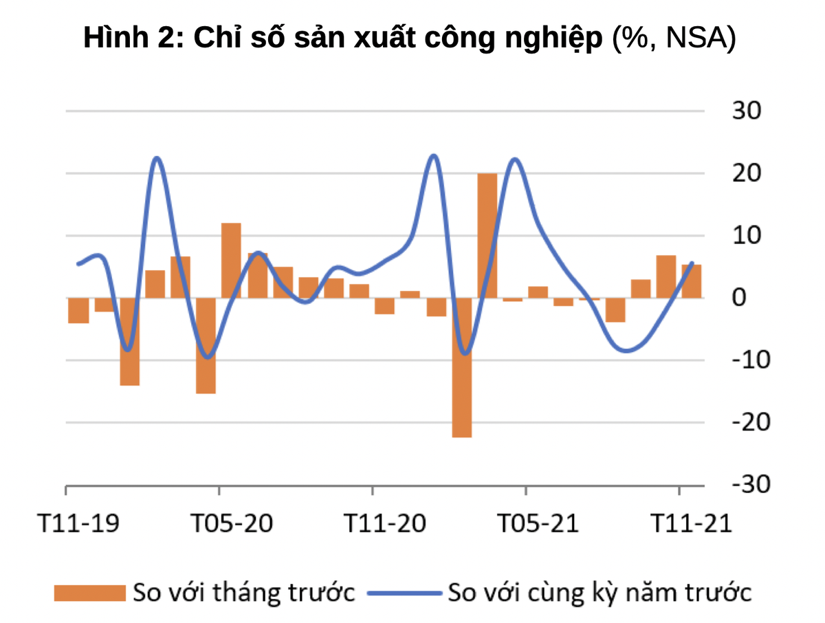 Báo cáo cũng cho biết, chỉ số sản xuất công nghiệp tăng 5,5% trong tháng 11 (so với tháng trước), một phần nhờ các hoạt động kinh tế được khôi phục ở các tỉnh thành phía Nam, bao gồm cả ở thành phố Hồ Chí Minh (tăng 13,3% so tháng trước). Với sự phục hồi mạnh mẽ trong tháng 11, chỉ số sản xuất công nghiệp đã vượt mức được ghi nhận cùng kỳ năm trước.