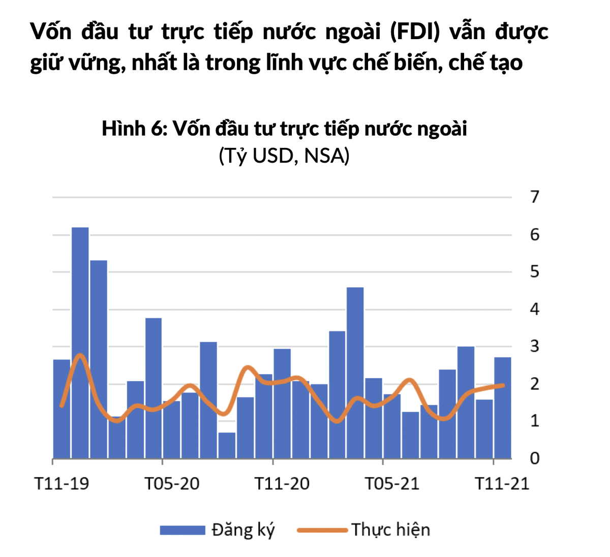 Trong 11 tháng đầu năm, Việt Nam đã thu hút được 26,5 tỷ USD vốn FDI đăng ký, tương đương với con số cùng kỳ năm 2020. Giải ngân vốn FDI tiếp tục phục hồi sau khi giảm mạnh trong quý III (tăng 4,3% trong tháng 11 so với tháng trước), nhưng vẫn chưa quay lại mức ghi nhận năm trước đó.