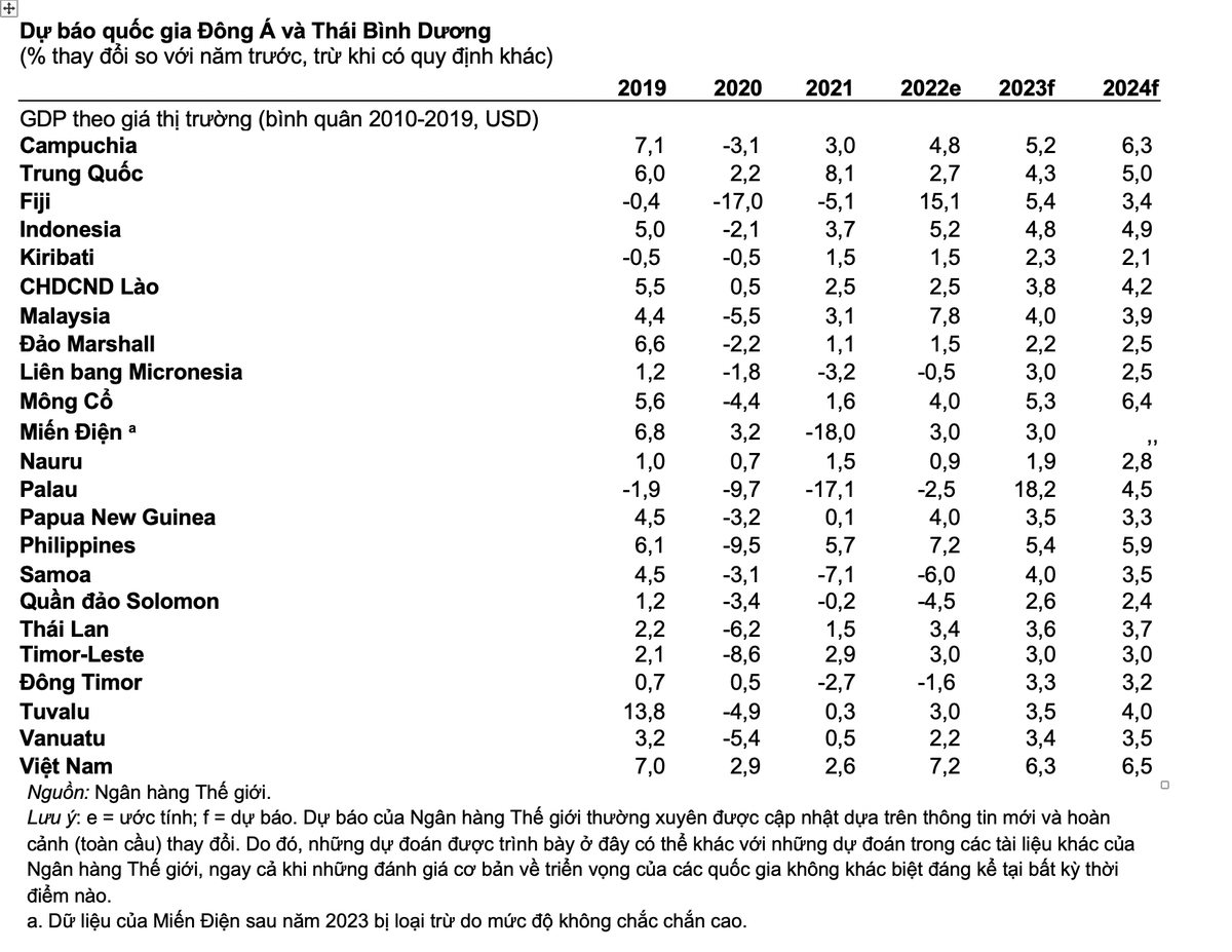 Triển vọng tăng trưởng ở khu vực Đông Á - Thái Bình Dương được Ngân hàng Thế giới dự đoán sẽ ổn định ở mức 4,3% vào năm 2023 khi việc nới lỏng các hạn chế liên quan đến đại dịch cho phép hoạt động ở Trung Quốc dần phục hồi. Những dự báo này thấp hơn so với hồi tháng 6 năm ngoái, khi mức tăng trưởng của khu vực dự kiến sẽ vượt 5% trong năm 2023 - 2024.