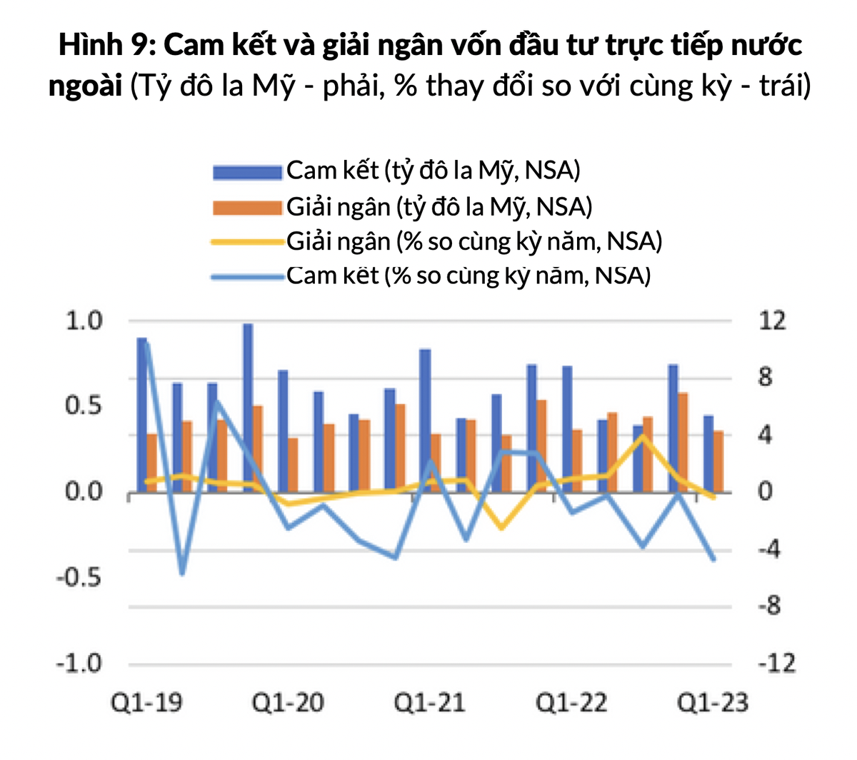 Đáng chú ý, theo WB, cam kết FDI giảm 40% so với cùng kỳ trong quý I/2023, quý thứ năm liên tiếp cam kết FDI giảm. Điều này phản ánh sự bất định gia tăng liên quan đến triển vọng kinh tế toàn cầu và việc thắt chặt các điều kiện tài chính để kiểm soát lạm phát ở các nền kinh tế phát triển. Giải ngân vốn FDI bắt đầu chậm lại trong quý I/2023 sau khi đạt kết quả khả quan trong năm 2022, đặc biệt là trong quý cuối cùng của năm.