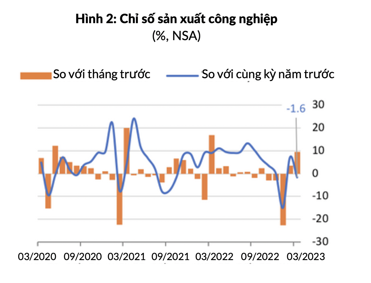 Bất chấp sự sụt giảm chung trong quý I/2023, sản xuất công nghiệp (IPI) đã có những dấu hiệu cải thiện tạm thời trong tháng 3 năm 2023 khi tăng 9,4% (so với tháng trước), đối lập với mức giảm mạnh vào tháng 1 (-22,7% so với tháng trước, một phần do nghỉ Tết) và mức tăng trưởng yếu (3,5% so với tháng trước) vào tháng 2. Bên cạnh đó, doanh số bán lẻ hàng hóa và dịch vụ tăng 1,9% (tháng/tháng) và 13,4% (so cùng kỳ) vào tháng 3 năm 2023. Đây là tháng thứ 13 liên tiếp doanh số bán lẻ ghi nhận mức tăng hai con số so với cùng kỳ.