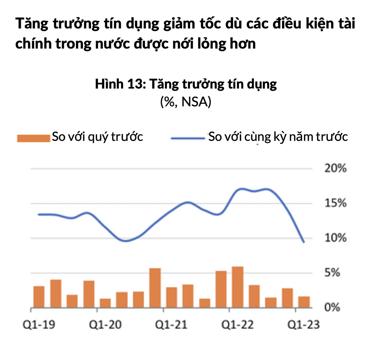 Báo cáo cập nhật tình hình kinh tế vĩ mô Việt Nam tháng 4 năm 2023 của Ngân hàng Thế giới (WB) vừa công bố cho biết, tăng trưởng tín dụng giảm tốc từ 14,17% (so với cùng kỳ) trong quý IV/2022 xuống 9,5% (so với cùng kỳ) trong quý I/2023 – mức thấp nhất kể từ năm 2020. Điều này phản ánh sự chậm lại trong hoạt động kinh tế (đặc biệt là trong lĩnh vực công nghiệp và bất động sản) cũng như môi trường lãi suất cao.