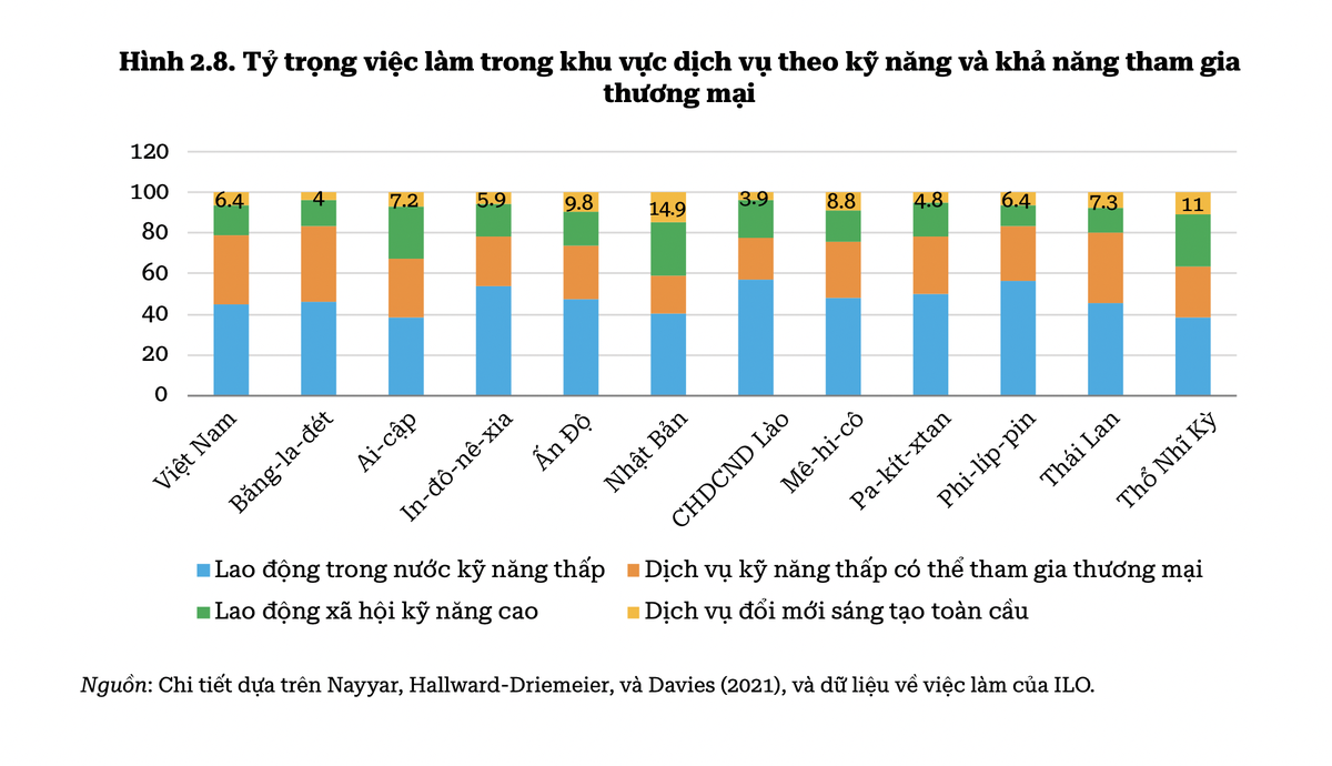 Kim ngạch xuất khẩu của những lĩnh vực dịch vụ giàu hàm lượng tri thức và đòi hỏi kỹ năng cao, được gọi là "dịch vụ đổi mới sáng tạo toàn cầu", chỉ chiếm 9% tổng kim ngạch xuất khẩu dịch vụ, và các lĩnh vực đó chỉ đóng góp 6,4% việc làm trong toàn khu vực dịch vụ, bao gồm công nghệ thông tin và truyền thông, tài chính và dịch vụ hành nghề chuyên môn, là những lĩnh vực dịch vụ có năng suất cao nhất trong nền kinh tế.