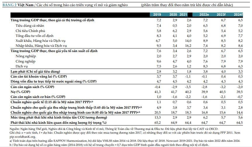 Về rủi ro trong nước, Ngân hàng Thế giới khuyến cáo, lạm phát cao hơn dự kiến, tình trạng thiếu lao động được ghi nhận trong các khu vực sản xuất và rủi ro tài chính gia tăng có thể ảnh hưởng đến triển vọng tăng trưởng.