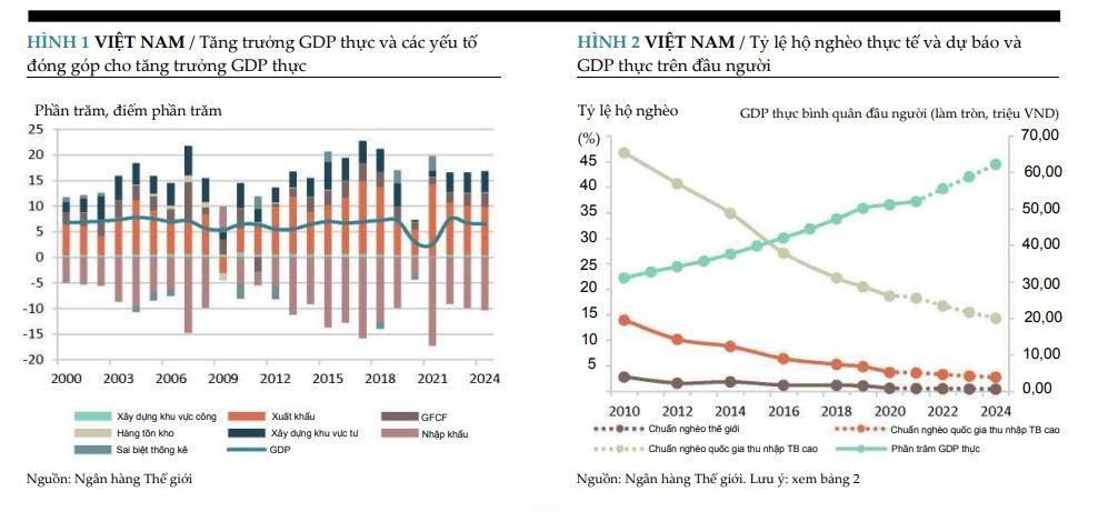 Sau một thời gian bị đình trệ do cuộc khủng hoảng COVID-19, tốc độ giảm nghèo dự kiến sẽ tăng lên, với tỷ lệ hộ nghèo giảm từ 3,7% vào năm 2021 xuống còn 3,3% vào năm 2022, dựa trên chuẩn nghèo LMIC của Ngân hàng Thế giới (3,65 USD/ngày 2017 PPP). Triển vọng kinh tế cho thấy vẫn còn tiềm ẩn nhiều rủi ro ở phía trước. Các rủi ro từ bên ngoài bao gồm áp lực lạm phát toàn cầu dai dẳng và suy giảm kinh tế sâu hơn dự kiến của các đối tác thương mại chính của Việt Nam (Hoa Kỳ, khu vực đồng Euro và Trung Quốc) và sự gián đoạn tiếp diễn trong Chuỗi giá trị toàn cầu (GVC).