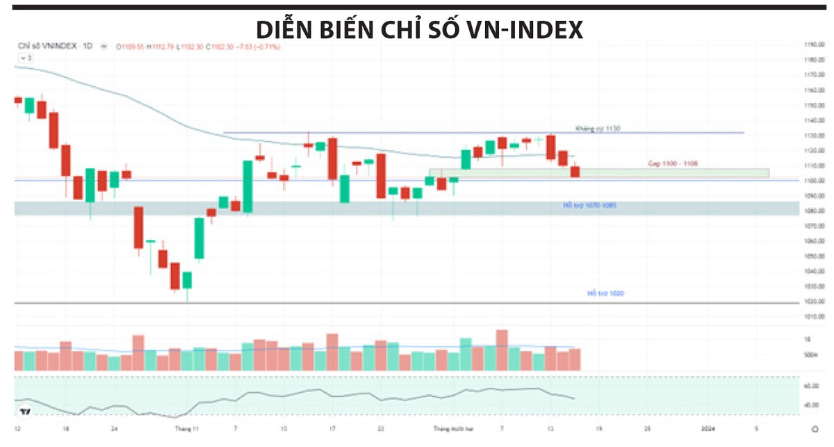 Tuy vậy, thị trường Việt Nam vẫn duy trì diễn biến giảm, các thông tin tích cực kể trên chưa hỗ trợ thị trường khả quan hơn. VN-Index kết thúc tuần vẫn giảm mạnh, đóng cửa tại 1.102,3 điểm, tương ứng mức giảm 2,3% trong tuần. Trên phương diện kỹ thuật, VN-Index đã tạo nên tổ hợp nến giảm Evening Star và đi theo đó là tổ hợp nến Three Black Crows. Đây là các tổ hợp nến đảo chiều và gia tốc đà giảm. Do đó, xác suất điều chỉnh giảm đang gia tăng dần, đặc biệt phiên thứ Sáu là phiên chỉ số này kiểm nghiệm lại hỗ trợ từ khoảng trống giá tại 1.100 - 1.110 điểm. Phiên kiểm nghiệm chưa được xác định là thành công khi VN-Index không được hỗ trợ bởi lực cầu, mà đóng cửa tại mức thấp nhất phiên.