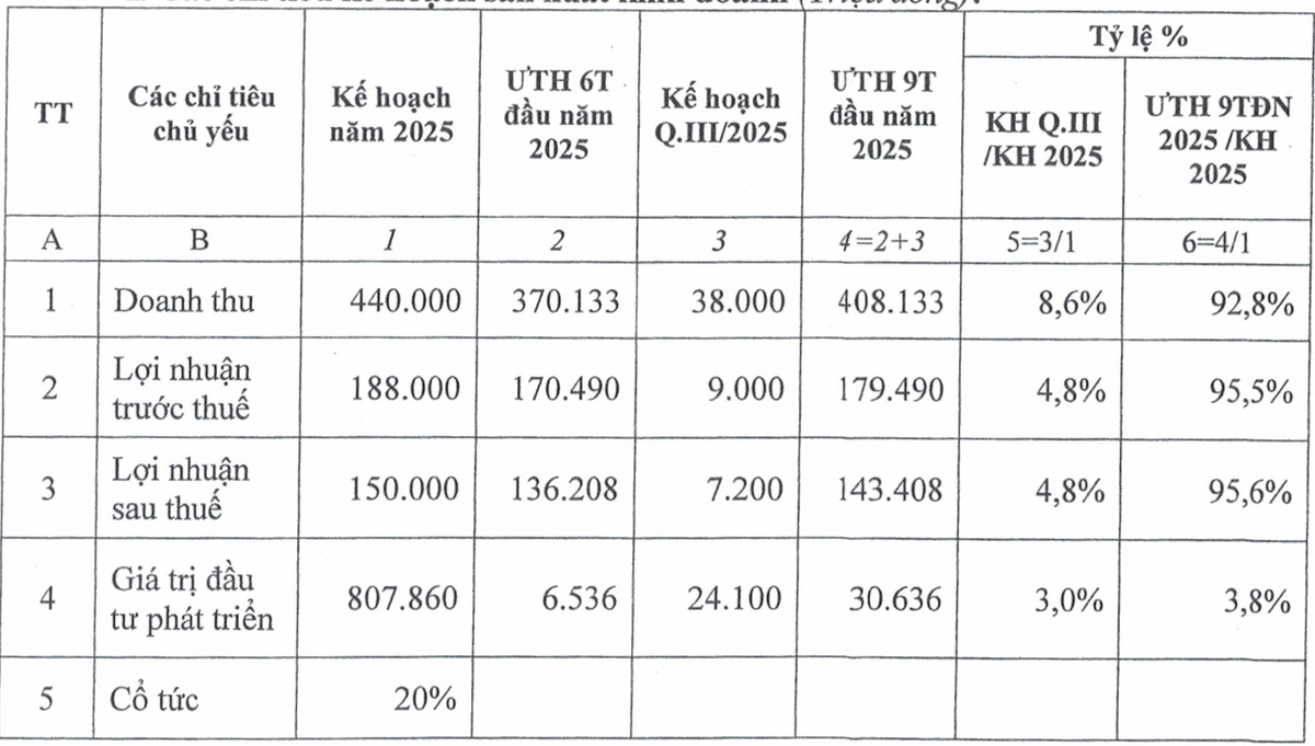 Bước sang quý III, ban lãnh đạo đặt mục tiêu doanh thu đạt 38 tỷ đồng và lãi sau thuế 7,2 tỷ đồng. Theo đó, ước tính 9 tháng 2025, Công ty có thể mang về hơn 408 tỷ đồng doanh thu và 143,4 tỷ đồng lợi nhuận sau thuế, đồng thời hoàn thành gần 93% mục tiêu doanh thu và gần 96% mục tiêu lợi nhuận cả năm.