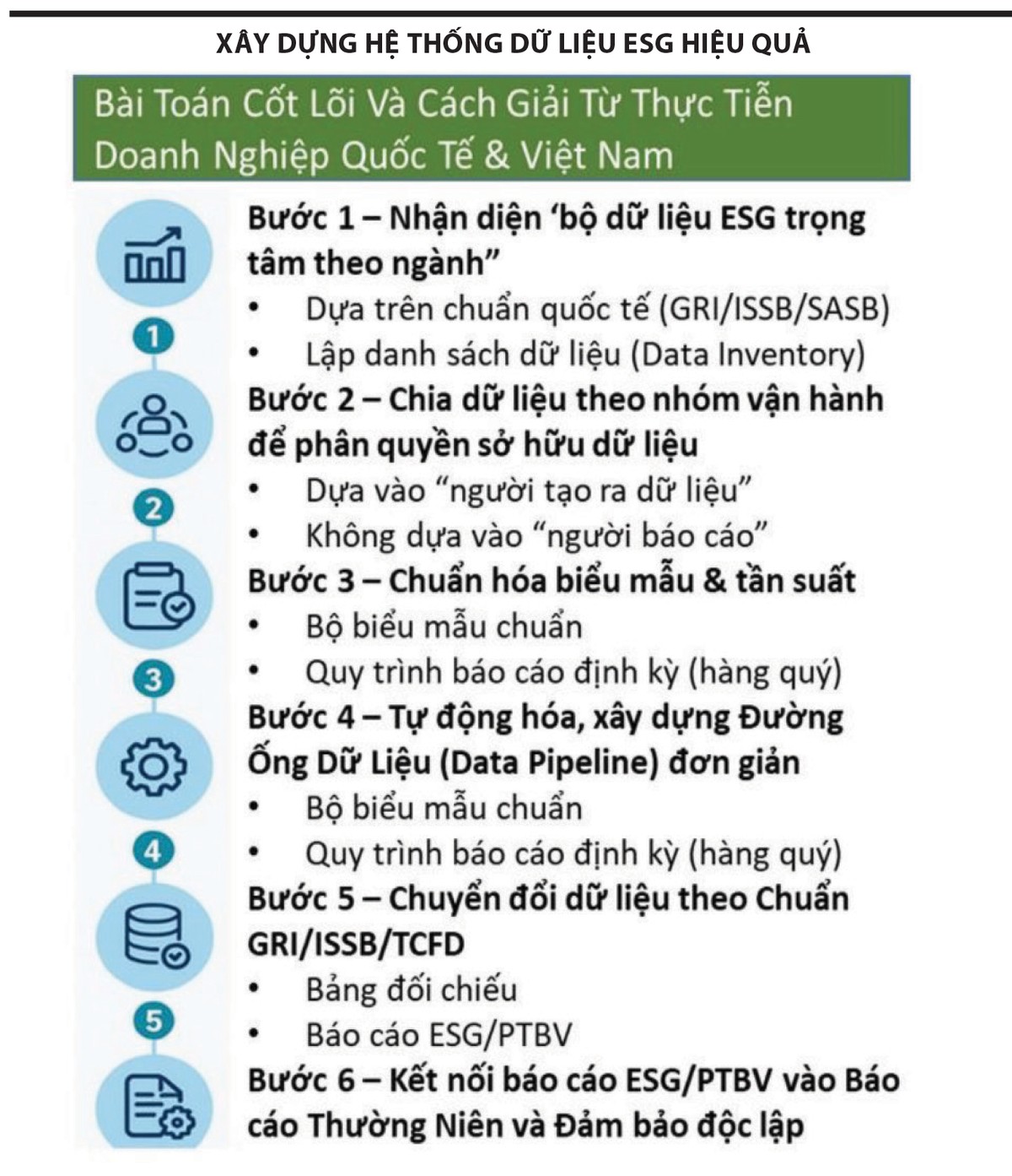 Thực hành tốt trên thế giới và một số doanh nghiệp tiên phong trong nước cho thấy, việc thu thập dữ liệu ESG không nên dồn hết cho một “ban ESG”, mà cần mô hình “Data Owner theo chức năng”. Ở đó, khối vận hành hoặc các nhà máy chịu trách nhiệm về năng lượng, nước, phát thải và chất thải; bộ phận sức khỏe (HSE) quản lý các dữ liệu liên quan tai nạn lao động và vi phạm an toàn; Nhân sự (HR) nắm dữ liệu tuyển dụng, đào tạo, phúc lợi và nghỉ việc; Quản lý mua sắm (Procurement) đứng ra làm đầu mối về nhà cung cấp, tiêu chí mua hàng bền vững; Tài chính và rủi ro (Finance và Risk) phụ trách dữ liệu về tín dụng xanh, rủi ro ESG và tổn thất do sự cố môi trường - xã hội; IT/Digital kiểm soát các chỉ số an ninh thông tin và sự cố dữ liệu.