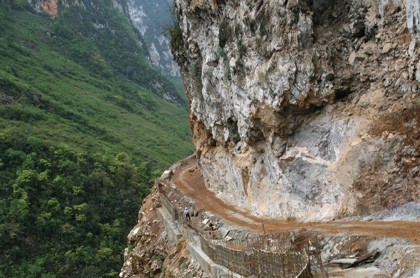 Đá ở Hà Giang toàn là đá tai mèo xám ngoét, địa hình lại hiểm trở, nên có lúc, thiết bị cơ giới cũng bất lực. Việc phá đá phải thực hiện bằng tay, không khác gì cảnh những thanh niên xung phong treo mình trên những vách đá dựng đứng, lấn từng cen-ti-mét để làm nên con đường đèo Mã Pí Lèng huyền thoại hơn 50 năm về trước.