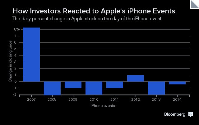Khi phiên bản iPhone đầu tiên xuất hiện trước công chúng vào năm 2007, các nhà đầu tư đã rất háo hức với tin tức này, đẩy cổ phiếu Apple tăng đến 8% trong ngày diễn ra sự kiện. Kể từ đó, phản ứng của thị trường với những lần ra mắt phiên bản mới hàng năm hầu như tiêu cực. 6 năm sau đó, cổ phiếu Apple đã có tới 5 lần giảm giá trong các ngày diễn ra sự kiện, trung bình mất 2%.